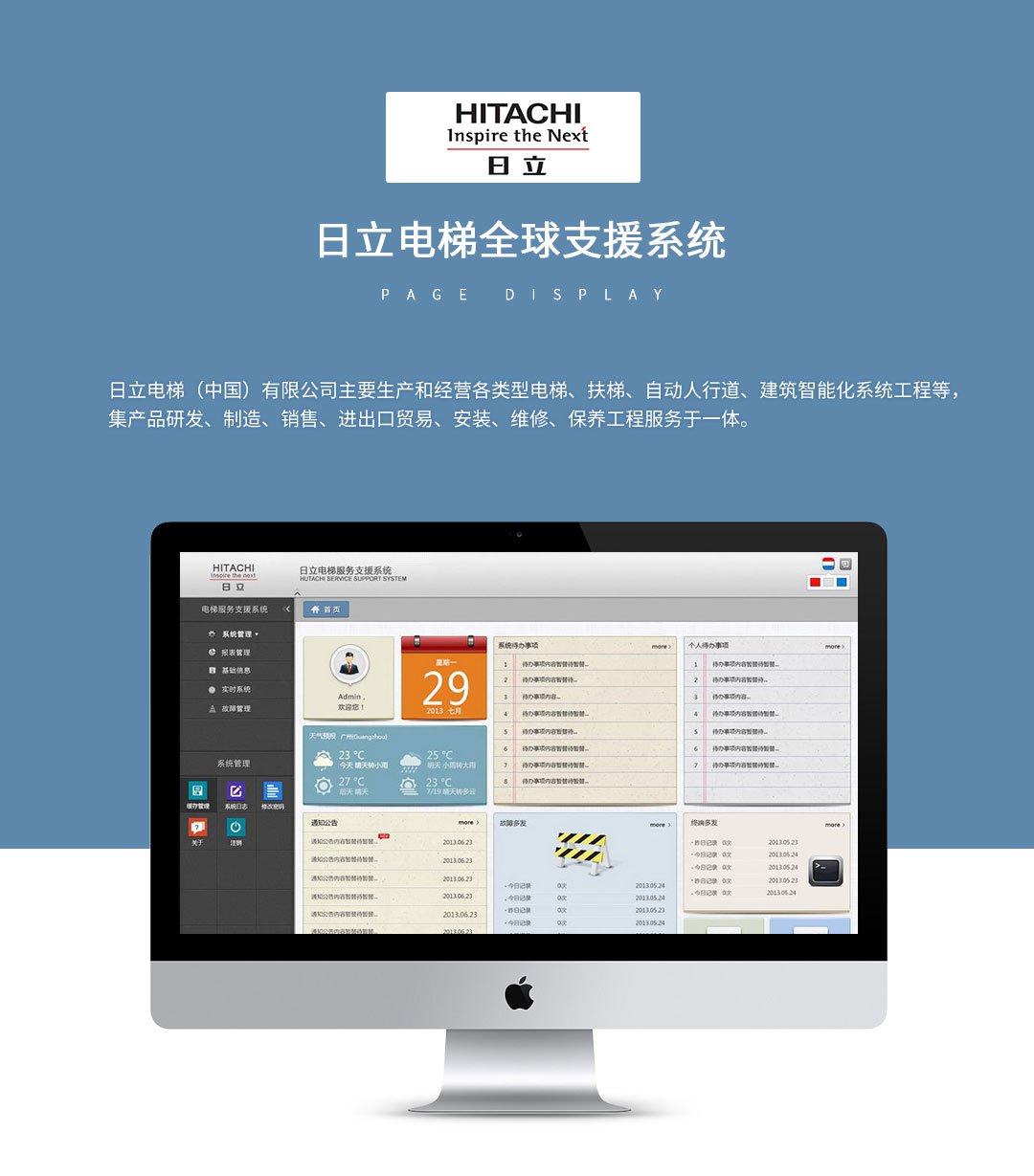 日立電梯(中國)有線公司主要生產(chǎn)和經(jīng)營各類型電梯、扶梯、自動人行道、建筑智能化系統(tǒng)工程等,集產(chǎn)品研發(fā)、制造、銷售、進出口貿(mào)易、安裝、維修、保養(yǎng)工程服務(wù)于一體。