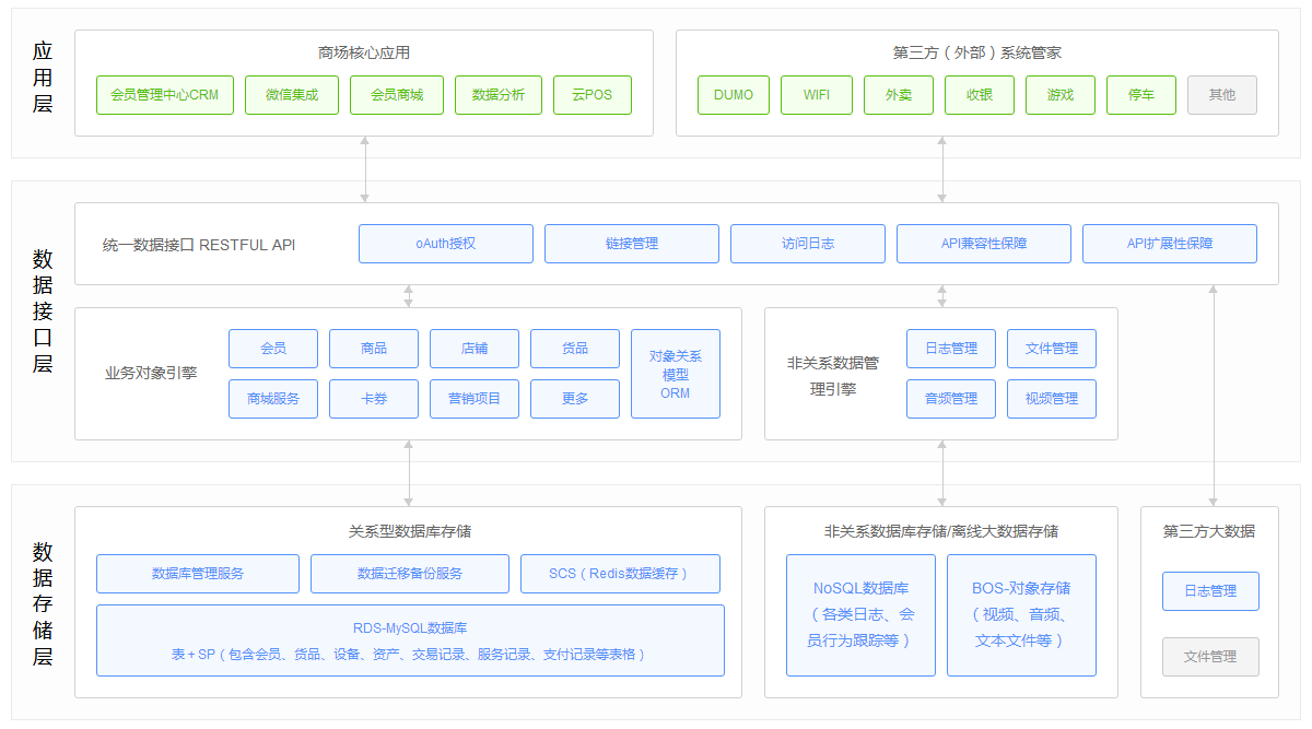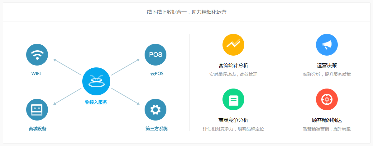 幫助購(gòu)物商場(chǎng)、超市、零售商店構(gòu)建完善的云端數(shù)據(jù)平臺(tái),打通線上線下會(huì)員體系,綜合結(jié)合WIFI、iBeacon人流定位信息、商店停車、外賣、訂位、收銀等外圍系統(tǒng)以及線上百度大數(shù)據(jù)人群畫像,提升客戶滿意度,拉動(dòng)會(huì)員消費(fèi)。支撐以下業(yè)務(wù)場(chǎng)景: