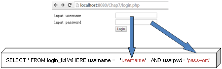 SELECT username, userpwd FROM login_tbl WHERE username=’admin’ –‘ and userpwd=”