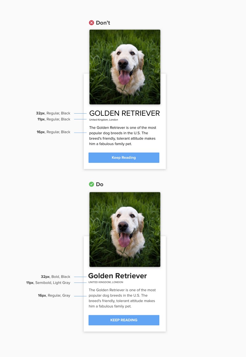 4、不要害怕使用大的字體比例(例如:24px標(biāo)題、16px正文、10px標(biāo)簽等)。更大的字體比例=更好的對(duì)比。