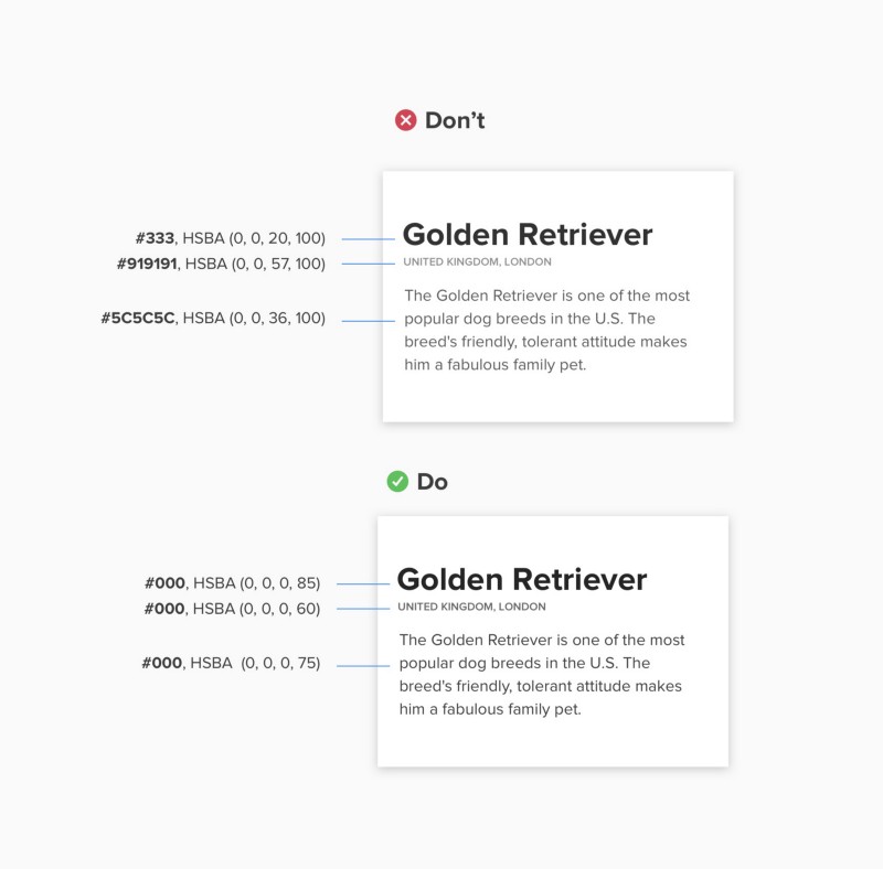 在我上面的實(shí)例中,我使用黑色作為主要顏色(#000),并根據(jù)其應(yīng)用的位置(如主要內(nèi)容,次要內(nèi)容等)降低其透明度。