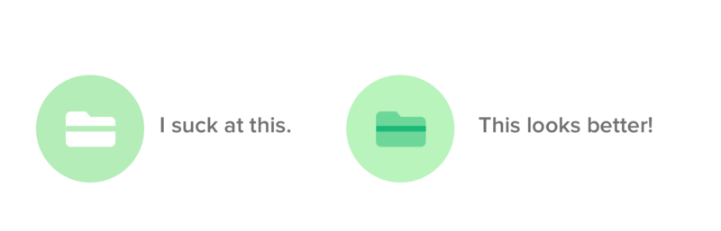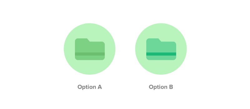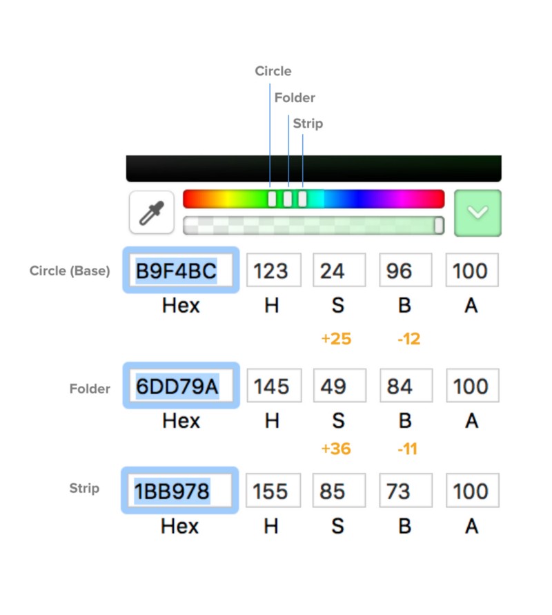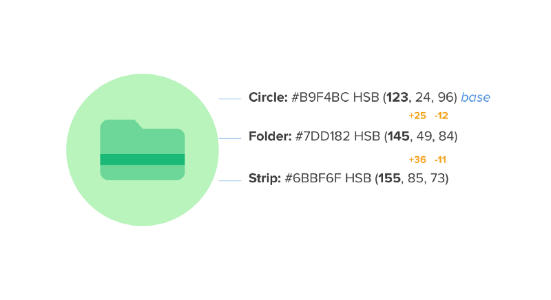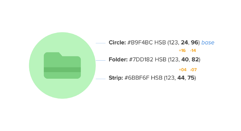 實(shí)際上有兩種方法,我們可以看到,兩個(gè)選項(xiàng)都有相同的基礎(chǔ)顏色#B9F4BC(圓圈背景),但在文件夾和條帶顏色上有不同。在我們開始的時(shí)候,請(qǐng)記住第一個(gè)數(shù)字對(duì)應(yīng)于色相,其次是飽和度,最后是亮度。